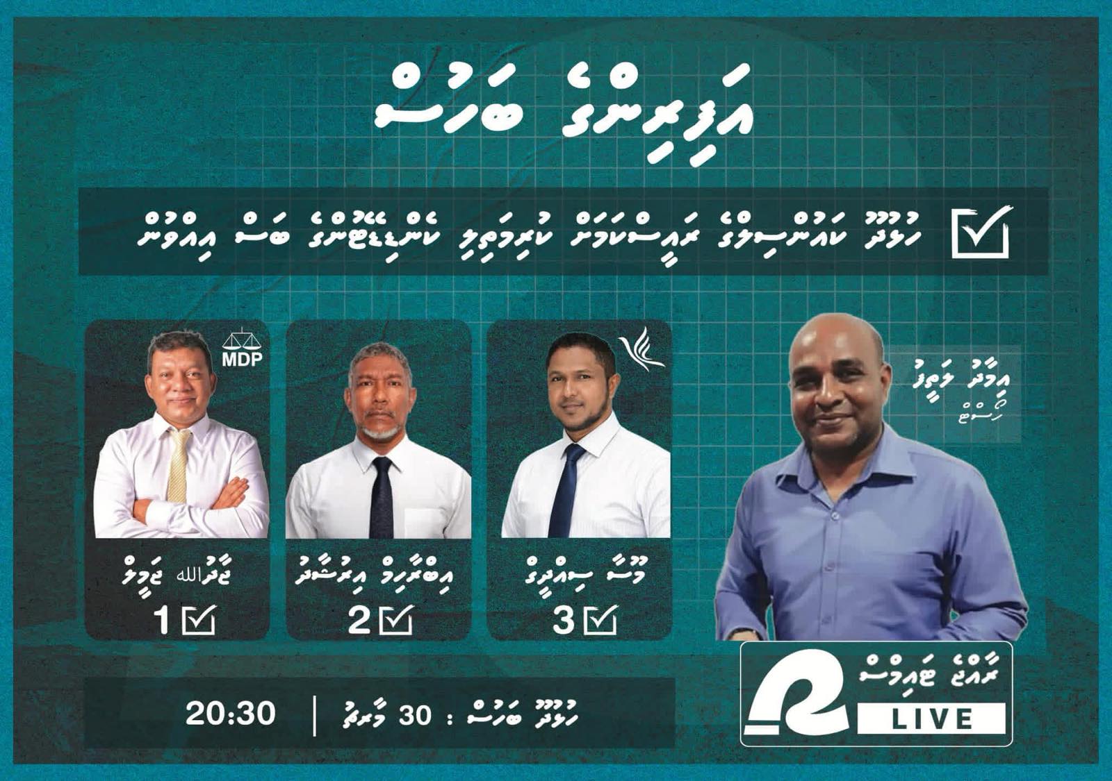ލޯކަލް ކައުންސިލް އިންތިހާބުގައި ހުޅުދޫ އަދި މީދޫ ދާއިރާގެ ރައީސް ކަމަށް ވާދަ ކުރައްވާ ކެންޑިޑޭޓުންގެ މެދުގައި ބަހުސް ބޭއްވުމަށް ނިންމައިފިއެވެ.